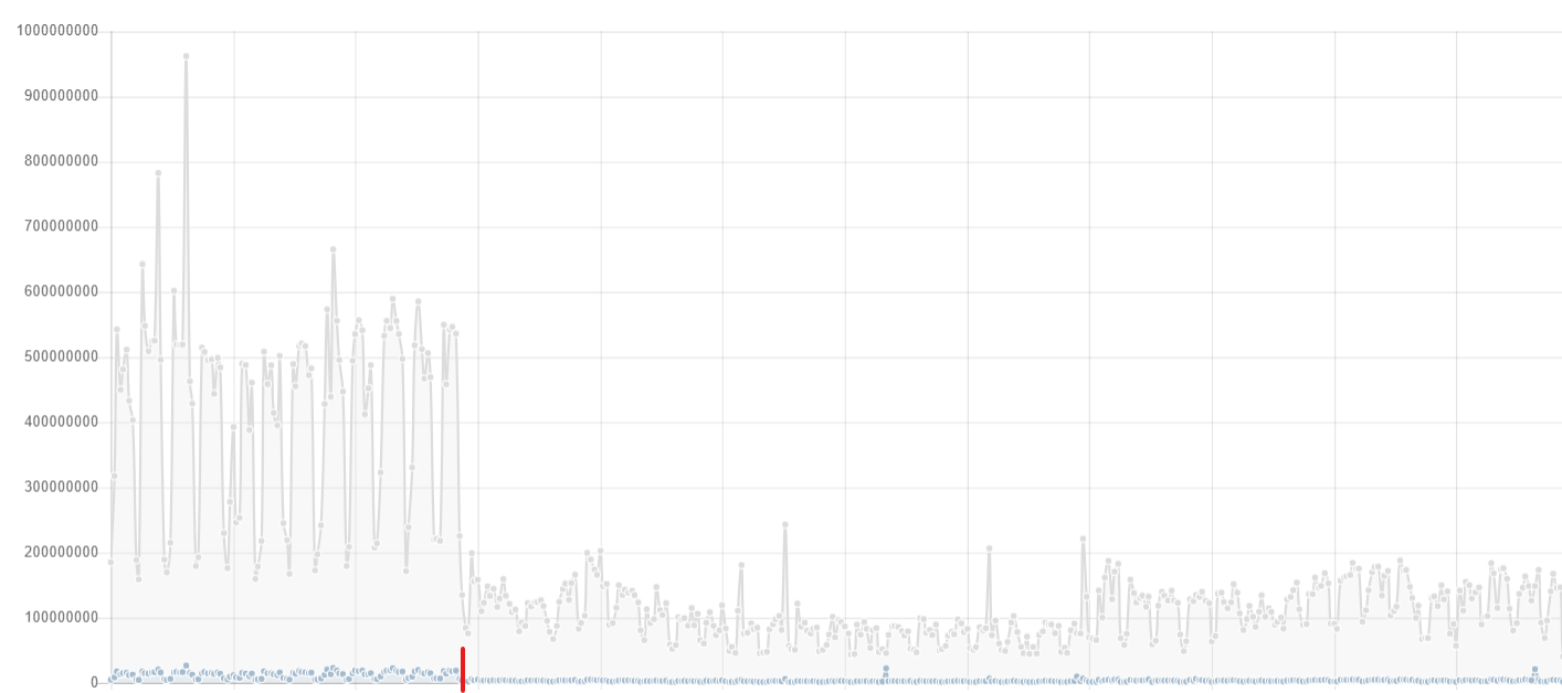 The graph above shows the traffic stats for that main dedicated server that was still solely responsible for hosting the website. The red mark is when we switched to repo.packagist.org and all the new mirrors started being used.