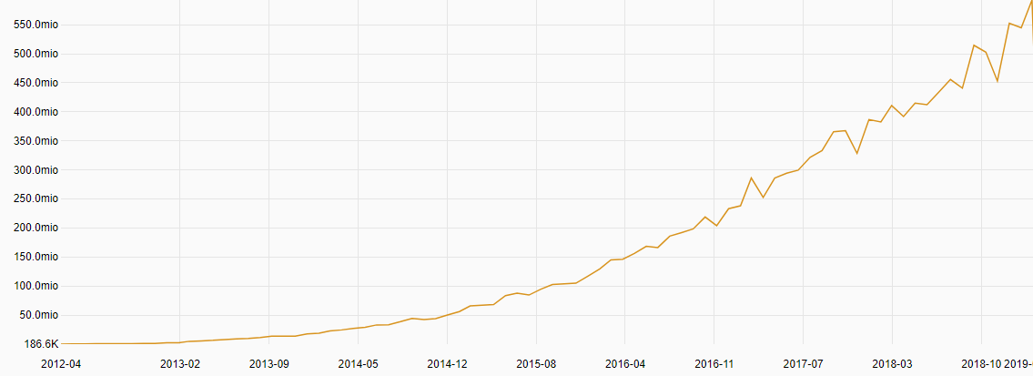 Looking at the install stats historically, in April 2015 we were doing ~67 million package installs per month, while March 2019 saw 592 million installs, an almost 9x increase in 4 years.