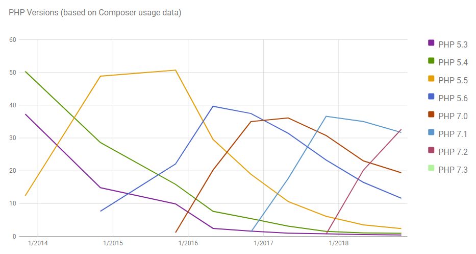 A quick note on methodology, because all these stats are imperfect as they just sample some subset of the PHP user base. I look in the packagist.org logs of the last month for Composer installs done by someone. Composer sends the PHP version it is running with in its User-Agent header, so I can use that to see which PHP versions people are using Composer with.