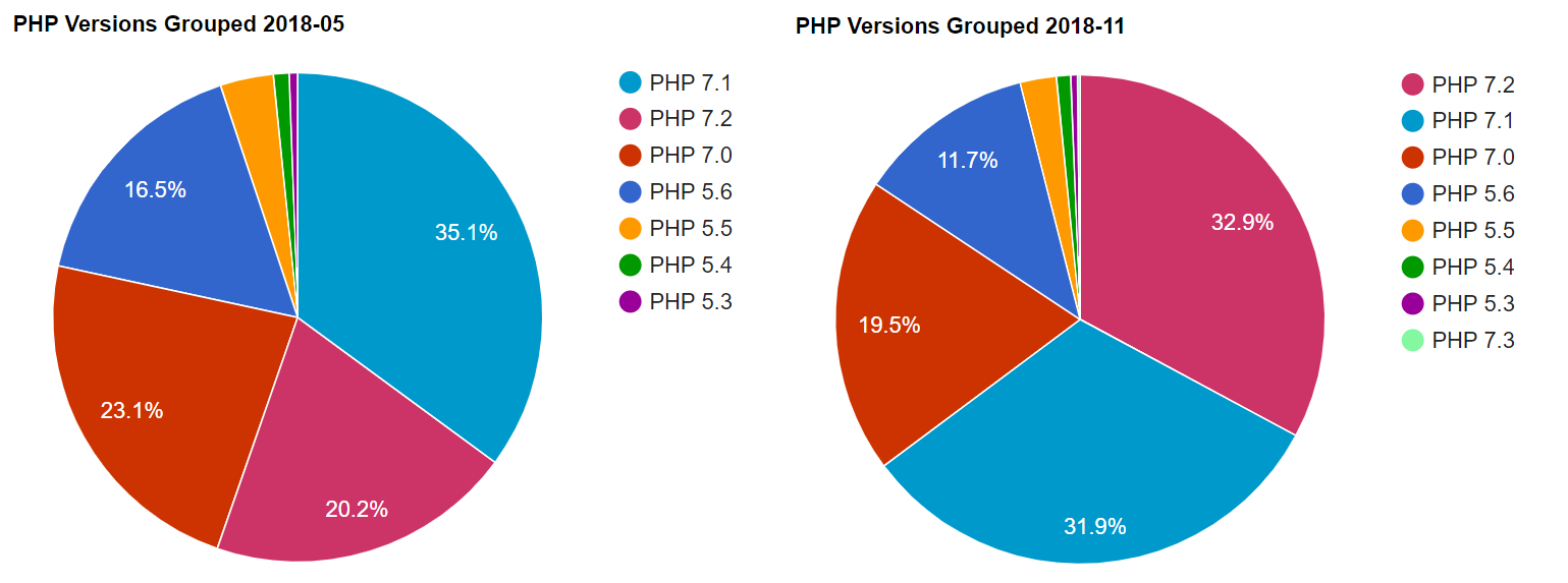 A few observations: PHP 7.2 passed 7.1 so we get back to a sensible order with the most recent versions seeing the most use. We are now at 84% of people using PHP 7+ and 96% using a PHP version that is still maintained for security updates. PHP 5.6 and 7.0 will reach end of life by late 2018 though so that's 31% (down 9% in the last six months) of users who are in need of an upgrade if we want to keep these numbers up!