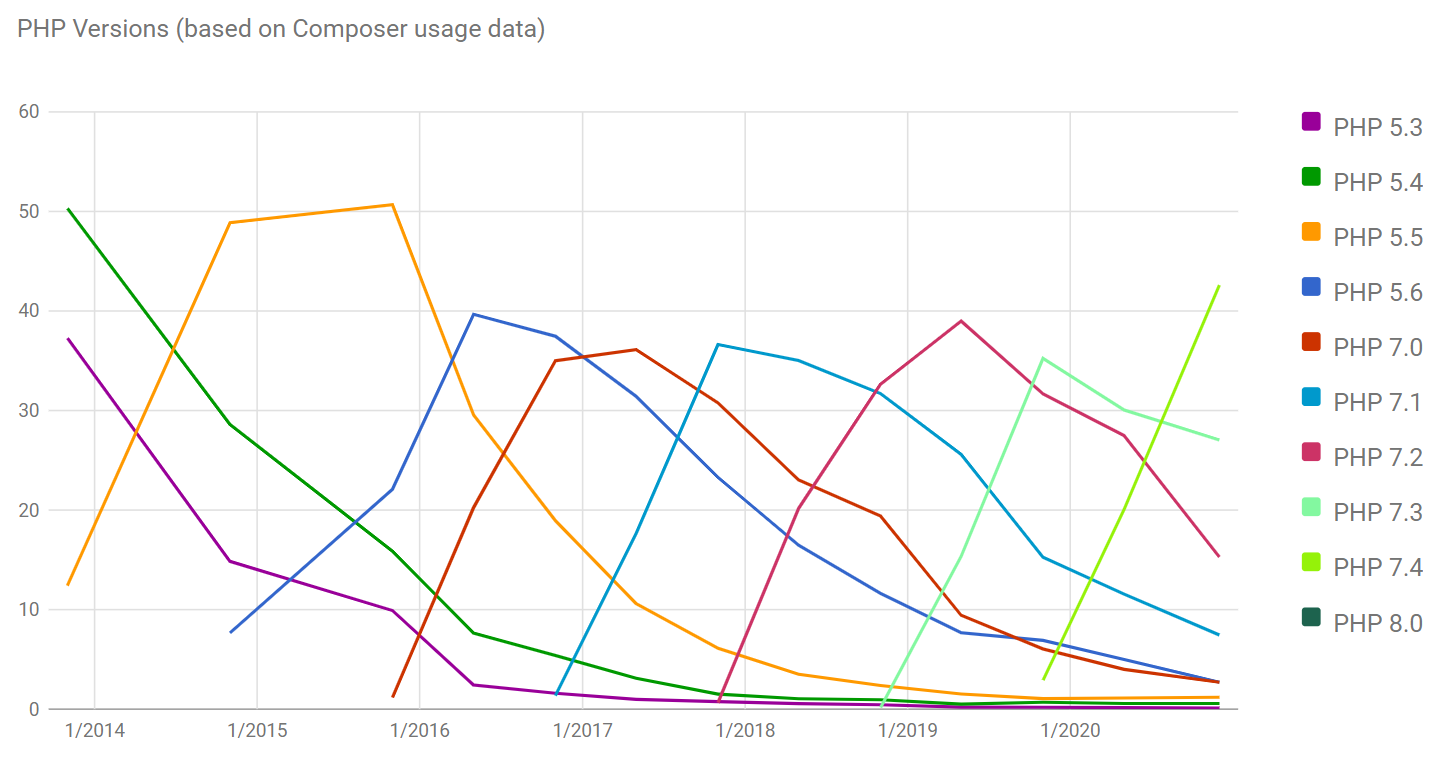 A few observations: 7.4 caught up amazingly, reaching the highest peak percentage since PHP 5.5 in 2015, which really was another era of people not upgrading anything. As usual in November with the new PHP release (8.0 came out last week!) and the older release (7.2) becoming EOL, the percentage of people using maintained PHP versions drops a bit suddenly. We are still at 69.7% of people using maintained PHP versions though which is not bad.