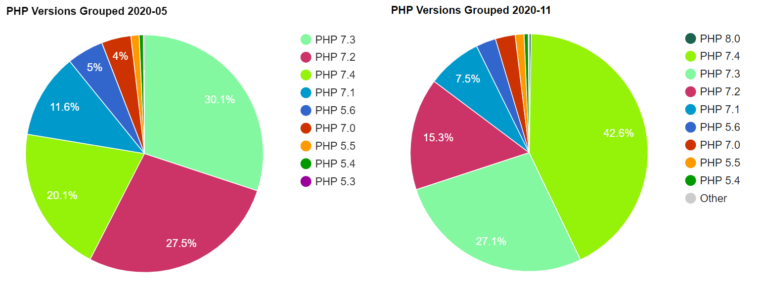 | PHP 7.4.12 | 13.10% | PHP 7.4 | 42.61% (+22.55) | ||