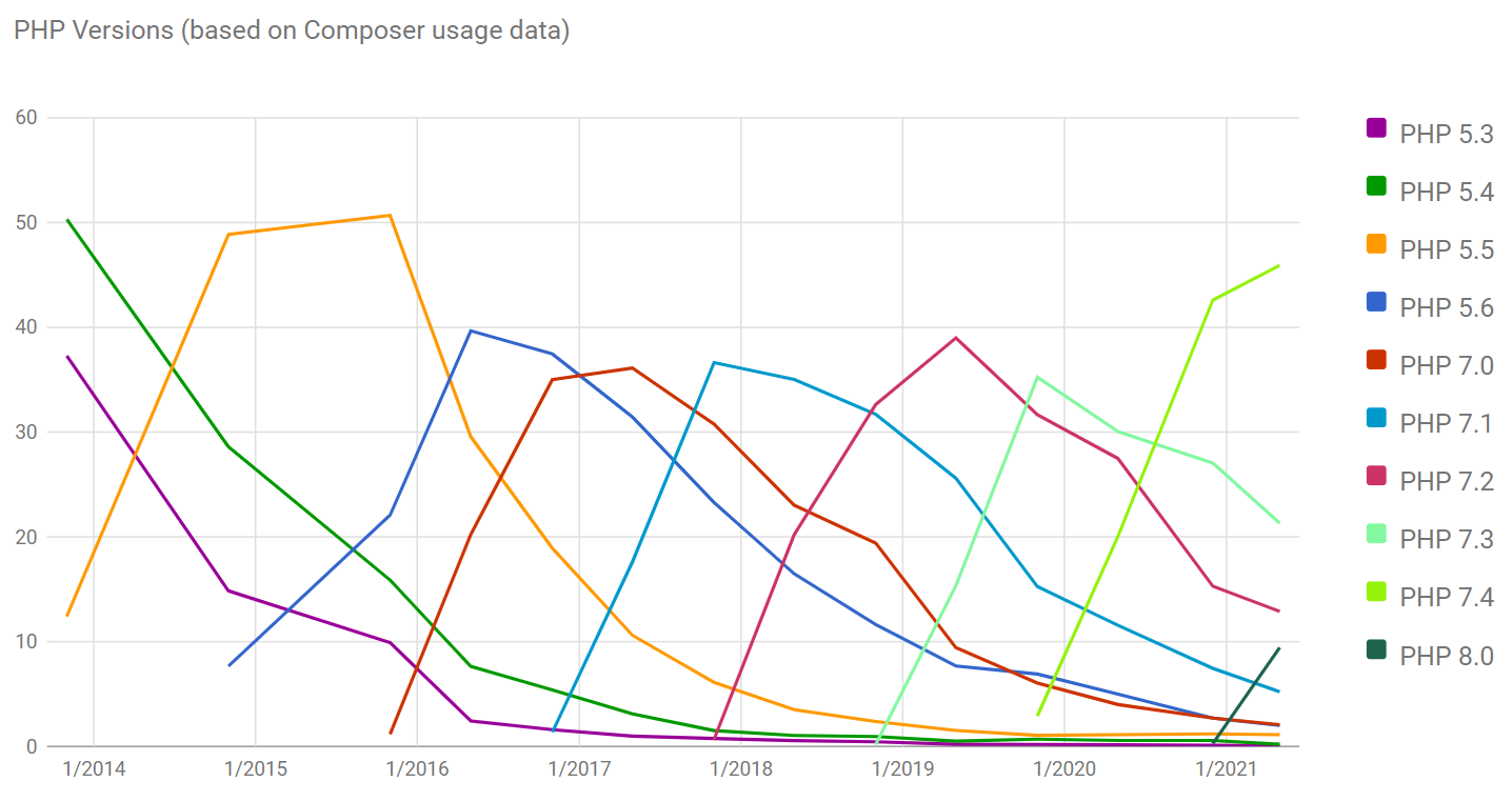 A few observations: 7.4 keeps going up despite being already very high, while PHP 8 is doing okish but sees only about half the adoption rate of the previous 7.x releases. Upgrading to it is definitely harder than upgrading to a minor release in my experience mostly due to some dependencies lagging in support for PHP 8, but it is well worth it feature wise so I would encourage people to try and push forward!