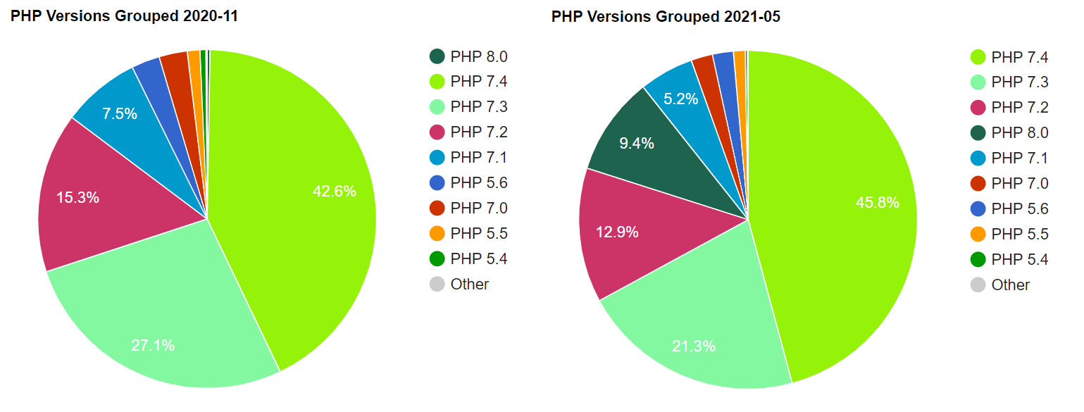 | PHP 7.4.16 | 13.26% | PHP 7.4 | 45.92% (+3.31) | ||