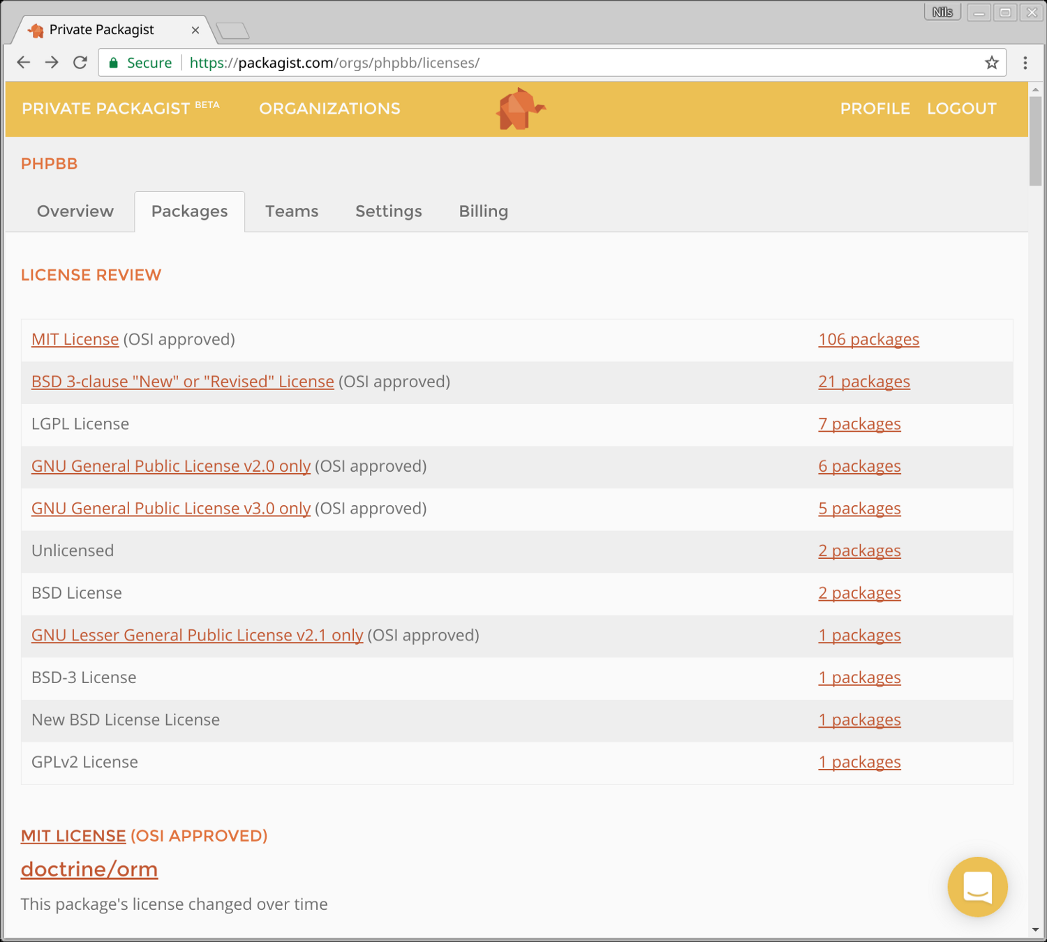 If you know of or find packages using Private Packagist License Review, which do not use an SPDX identifier, please get in touch with the maintainers or simply send them a pull-request. Often it’s simply a matter of slightly modifying the identifier. By the way, if your package is dual licensed, please specify an array of licenses in your composer.json instead of hardcoding the word “or” into the string to help automated systems understand your licensing.
