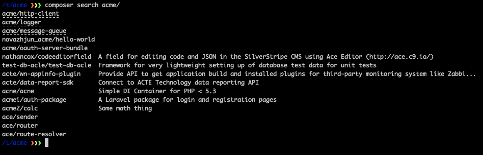 We've enhanced Composer search to include clickable package URLs in the results. When you run composer search acme, packages already in your Private Packagist organization now display as links you can click directly from your terminal to view detailed information.
